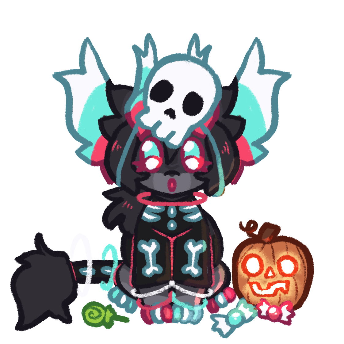 Oh no! The Orin from the April 2025 Invite Raffle has re-appeared, but their traits have evolved and miasma spills from the cracks. It looks like they're so far corrupted, that even purifying them will not revert them to their original first form. Contrary to their demure green and yellow sprite colors, they are fully saturated, like an energy drink that's meant to amp you up to the max. Their ringed eyes have a crazed look and their keratin hooves almost seem to bubble, but it doesn't look like they're in pain or crying-- on the contrary, they seem rebellious, bumping out loud music on their headphones and blowing large gum bubbles. Approach this Orin with caution... it seems they're ready to explode with even the littlest prod.